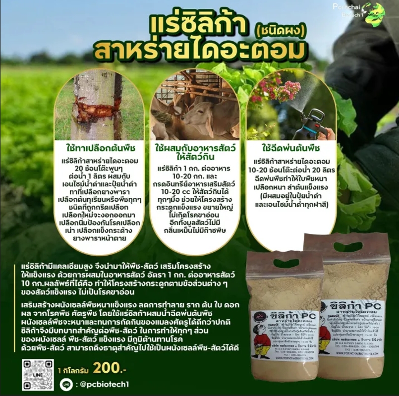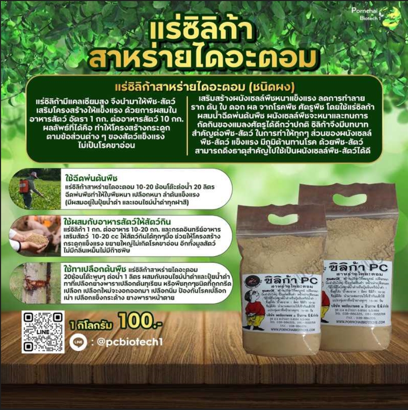 - แร่ซิลิก้าสาหร่ายไดอะตอม 10-20 ช้อนโต๊ะ ต่อน้ำ 20 ลิตร ฉีดพ่นพืชทำให้ใบพืชหนา เปลือกหนา ลำต้นแข็งแรง (มีผสมอยู่ในปุ๋ยน้ำดำ และเอนไซม์น้ำดำทุกฝาสี)